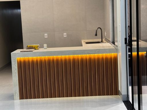O imóvel conta com 3 suítes, incluindo uma suíte master ampla com 22,82 m² e duas suítes estilo americano. A sala possui pé-direito duplo, criando um ambiente moderno e elegante. A área gourmet integrada à cozinha é perfeita para receber, com churrasqueira a carvão e excelente integração dos espaços.