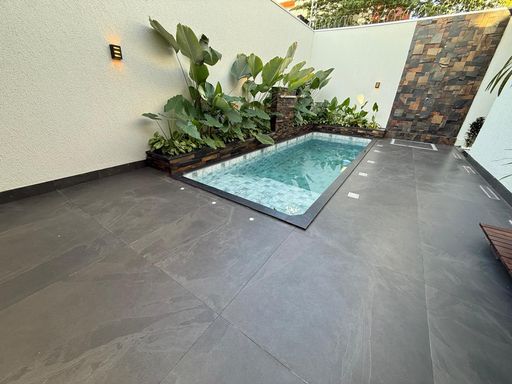 A varanda gourmet é ampla e integrada, equipada com churrasqueira e ideal para receber. A área de lazer possui piscina de 5,30 x 1,80 m, com cascata, hidro e iluminação, proporcionando um ambiente perfeito para relaxamento.