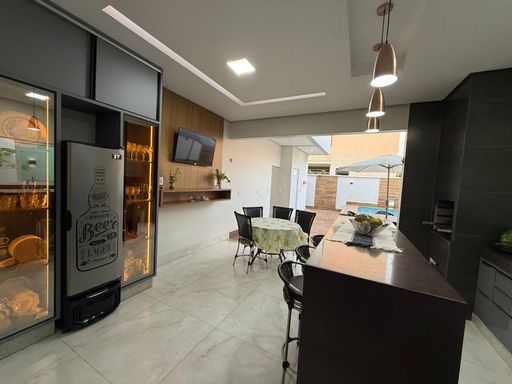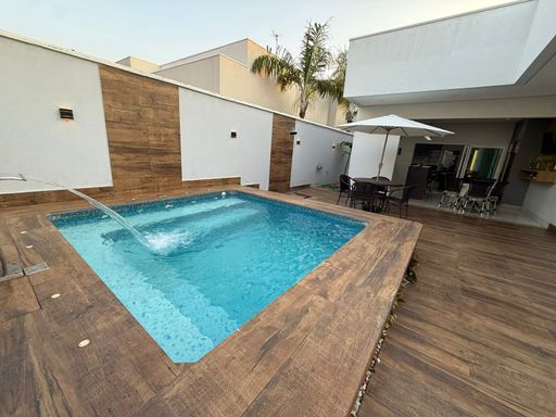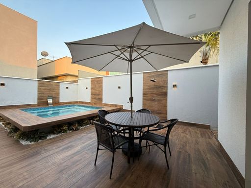 Área de lazer com espaço gourmet, churrasqueira, piscina com hidromassagem, lavabo e ducha. Imóvel novo, de alto padrão e pronto para morar.