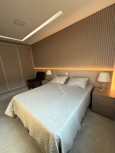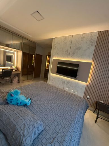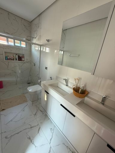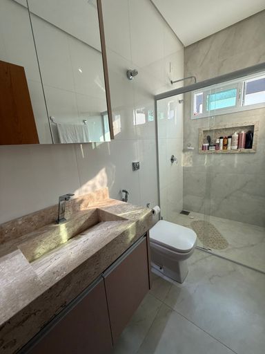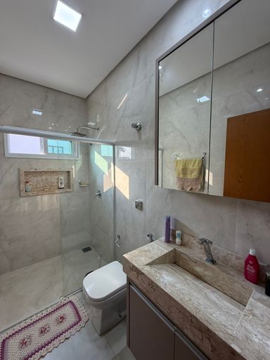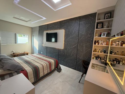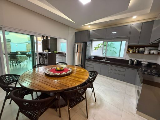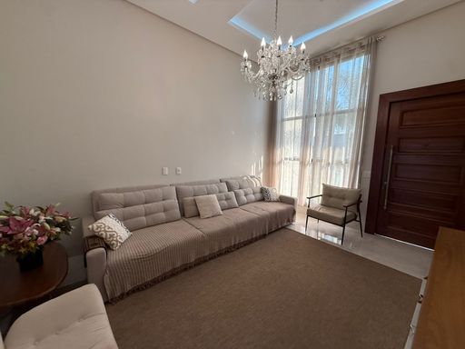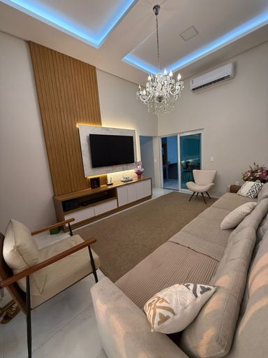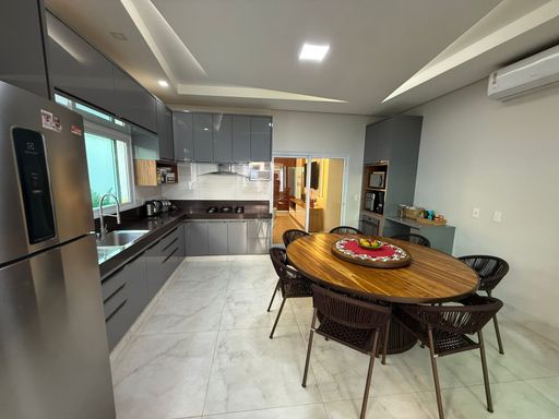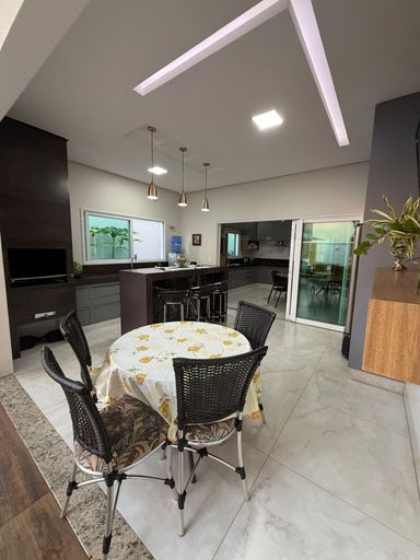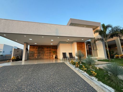 Casa térrea mobiliada no Condomínio Mirante do Lago, com 210m² de construção em lote de 408,80m². Possui 3 suítes (1 master com closet), escritório, salas de estar/TV e jantar integradas à cozinha, despensa e área de serviço. Conta ainda com energia solar, poço semiartesiano e carregador para carro elétrico. São 4 vagas de garagem e belo jardim iluminado.