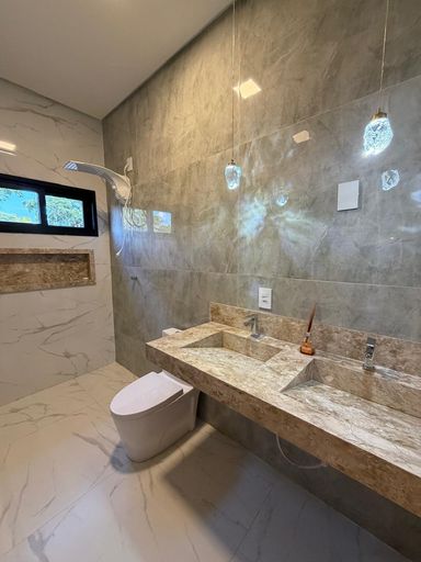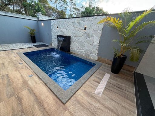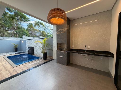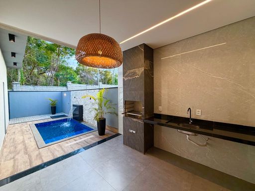A área de lazer é completa, com churrasqueira, piscina com hidromassagem, cascata e iluminação em LED, além de lavabo externo para maior praticidade. A casa ainda oferece área de serviço isolada, paisagismo natural e projeto luminotécnico que valoriza cada ambiente.