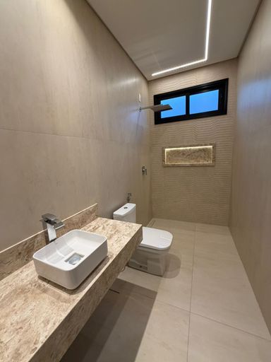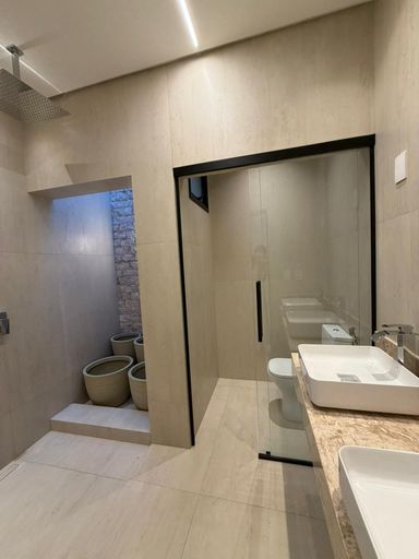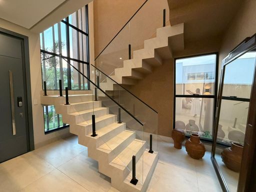 O pé-direito estendido de 3,5 metros no térreo valoriza a iluminação natural e a sensação de amplitude. A residência possui sistema de automação completo, sonorização dual zone, e torneiras e chuveiros com água quente e fria em pontos estratégicos, garantindo uma experiência de conforto e praticidade incomparável.