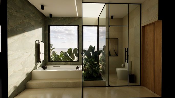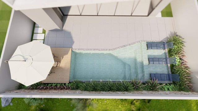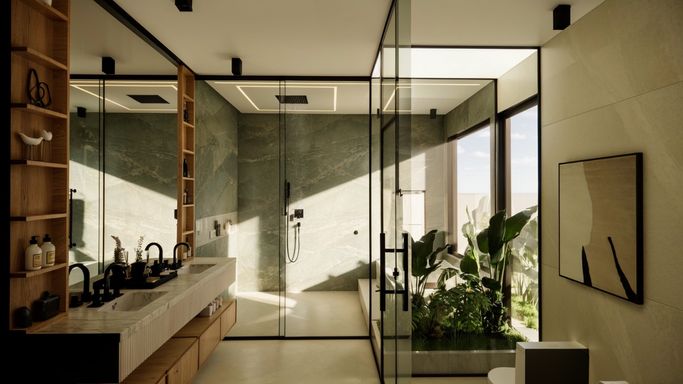 São 400m² de área total, sendo 340m² construídos, com 5 suítes (3 com espaço para closet), garagem em balanço para 3 carros, elevador de acesso ao 1º andar, piscina aquecida com design exclusivo e banheiro spa na suíte master — com banheira de hidromassagem, cromoterapia, jardim de inverno e sonorização automatizada.